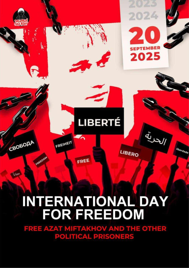 20 сентября организация Solidarité FreeAzat организует международный день в поддержку освобождения Азата Мифтахова и других российских политзеков. Акции пройдут в 14.00 в Париже (Square Robert Schuman 20 boulevard Lannes) и Берлине (Unter den Linden, напротив российского посольства).