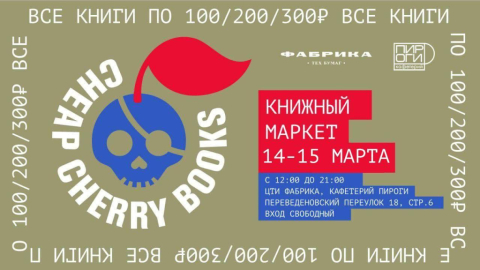 Ярмарка Cheapcherrybooks будет проходить 14-15 марта в 12:00-21:00 в ЦТИ «Фабрика» (кафетерий ПИР/ОГИ, Переведеновский переулок 18, стр. 6). На ней будут представлены в том числе книги кооперативов «Компост» и «Напильник», издательств «Эгалите», «Радикальная теория и практика» и «Чёрный квадрат».