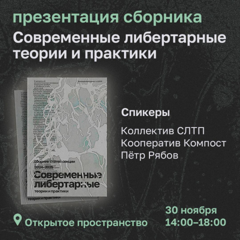 В воскресенье, 30 ноября, в 14.00-18.00 кооператив «Компост» приглашает на презентацию сборника «Современные либертарные теории и практики» в московское Открытое пространство (Плетешковский пер., 8с1, м. Бауманская). Это независимый сборник статей от докладчиков и докладчиц одноимённой секции на конференции «Векторы» за 2024 и 2025 годы.