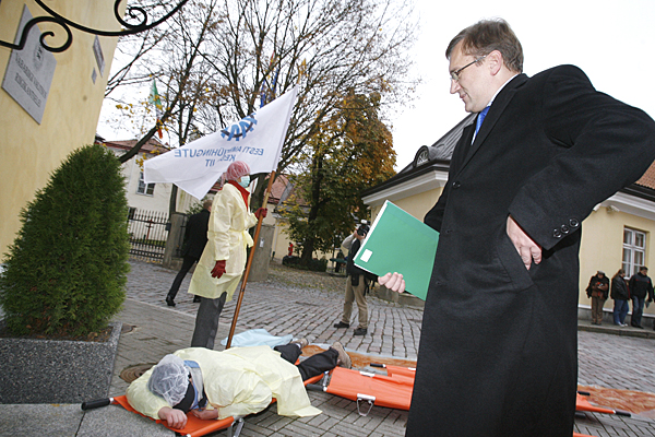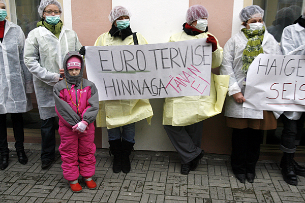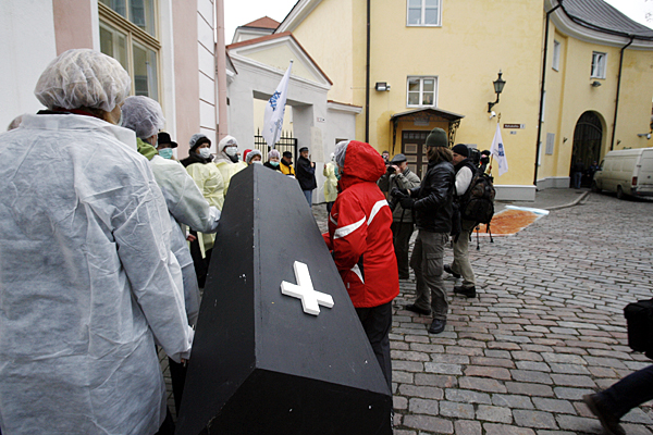 У дома Стендбока люди (около 50 человек) образовали символическую очередь на лечение, туда же они принесли манекенов на носилках и черный гроб. "Поскольку планируется сократить цены на медицинские услуги, то мы видим в этом угрозу для пациентов и системы здравоохранения в целом", - сказал президент Союза медсестер Эстонии, находящийся также на митинге. Медики принесли с собой и плакаты с лозунгами "Мы накопили денег, давайте их использовать!" и "Евро за счет здоровья - спасибо, НЕТ!". Прибывающих министров медики встретили свистом и раздали им обращение, при этом министр финансов Юрген Лиги отказался взять документ.